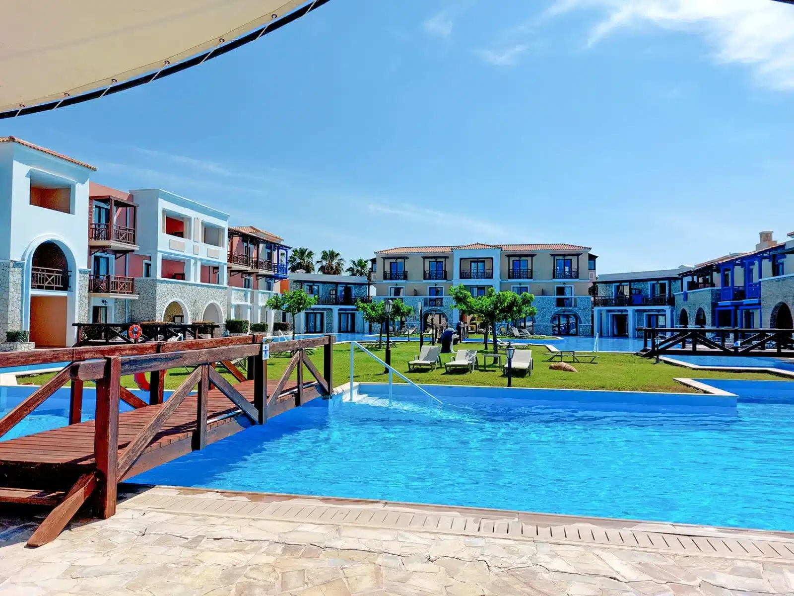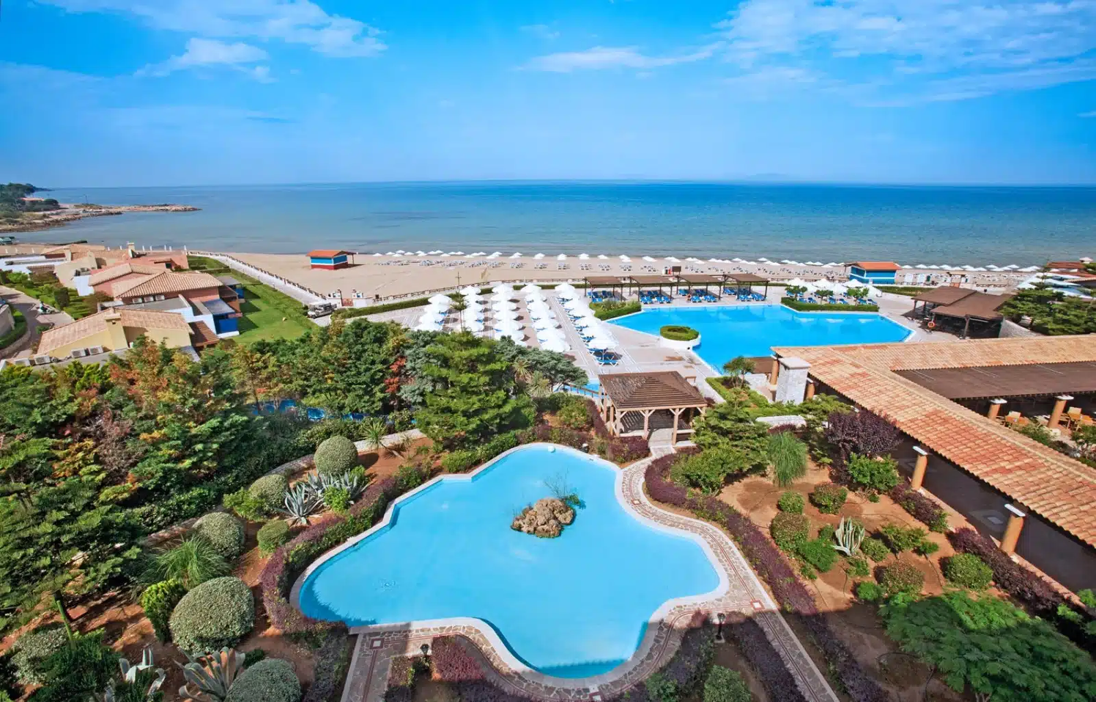 Il resort si trova sulla costa occidentale del Peloponneso, a Skafidia, ed è raggiungibile dall’aeroporto di Araxos che dista circa 60 km. La cittadina di Pyrgos si trova a 13 km ed il suggestivo sito archeologico di Olimpia a 30 km. Il complesso si estende su un lungo tratto di spiaggia ed è composto da 5 palazzine, dove sono ubicate alcune tipologie di camere e i servizi comuni. Inoltre, sono disponibili confortevoli bungalow dislocati nel curato giardino, alcuni dei quali condividono la piscina tra di loro.