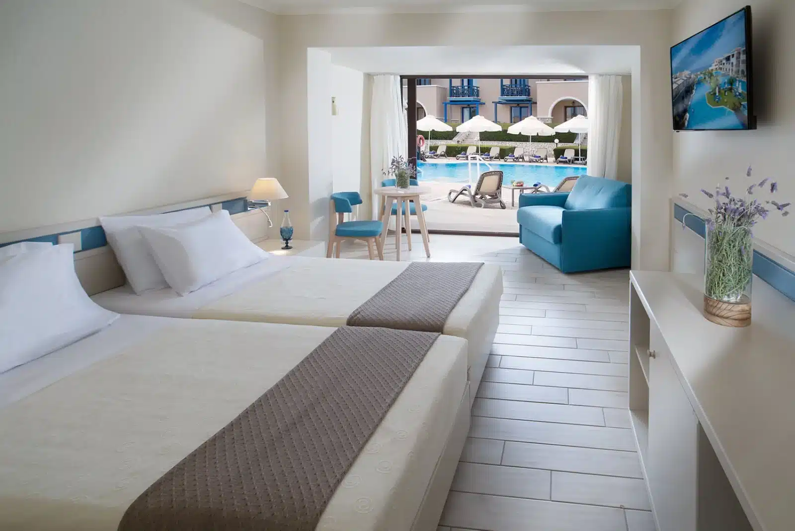 Direttamente sulla lunga e ampia spiaggia di sabbia, affacciato su un tratto di mare dalle acque cristalline, è l’ideale anche per le famiglie per l’accesso facilitato al mare. Il resort conta un totale di 42 piscine, la maggior parte delle quali condivise tra i bungalow; a disposizione di tutti gli ospiti 4 piscine per adulti, di cui una con un divertente scivolo d’acqua, una piscina per bambini e infine una piscina presso la SPA (a pagamento). Lettini, ombrelloni e teli mare gratuiti sia in piscina che in spiaggia. A pagamento: gazebo in spiaggia.