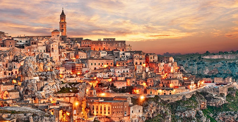 Prima colazione in hotel e partenza per Alberobello la fiabesca “Capitale dei Trulli”, caratteristico paesino delle Murge, famoso per essere quasi interamente costituito da trulli, piccoli edifici di origine antica in pietra calcarea a base circolare o quadrangolare con copertura conica. I trulli di Alberobello, divenuti un simbolo della Puglia, sono annoverati dall’Unesco nel Patrimonio Mondiale dell’Umanità. Pranzo libero e, nel pomeriggio, partenza per Matera, “città dei Sassi”, una tra le città più antiche del mondo. Il nucleo urbano originario, sviluppatosi a partire dalle grotte naturali scavate nella roccia, e successivamente, modellate in strutture sempre più complesse all’interno di due grandi anfiteatri naturali ,che sono : il Sasso Caveoso e il Sasso Barisano. Questa città è patrimonio dell’UNESCO dal 2014 è stata designata Capitale Europea della Cultura per il 2019. Cena tipica in ristorante a Matera, al termine passeggiata per ammirare la fiabesca città dei Sassi illuminata come un presepe. Rientro in hotel per pernottamento.