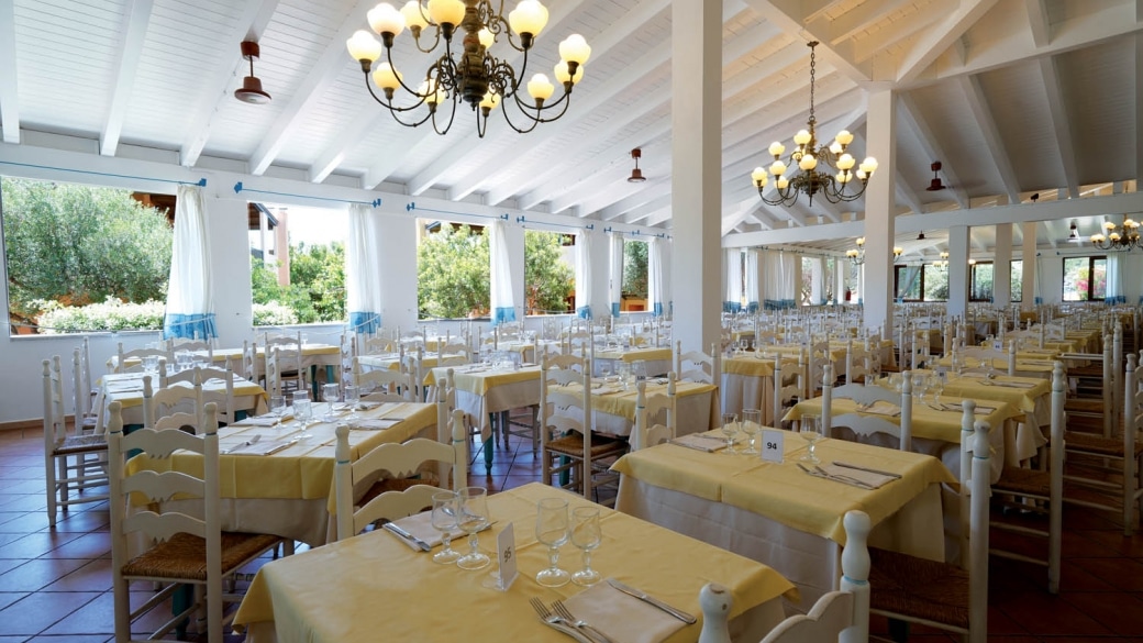 Ristorante: Il Resort dispone di un apprezzatissimo ristorante con veranda coperta aperta su due lati e sala interna climatizzata. Il servizio offre giornalmente un’ampia varietà gastronomica in un’atmosfera serena e informale con servizio a buffet. La prima colazione, oltre alla consueta caffetteria, propone un’ampia selezione di alimenti dolci e salati. Per il pranzo e la cena la ricca e variegata proposta gastronomica comprende specialità piatti della cucina tipica sarda e della cucina nazionale, con acqua naturale o gassata in bottiglia e vino della casa alla spina bianco o rosso inclusi ai pasti. Durante la settimana sono previste due serate a tema; una sarda, con pietanze tipiche regionali e una “del pescatore” a base di pesce (pietanze alternative a base di carne e/o vegetariane sono sempre presenti). Il ristorante non offre un menù vegetariano e/o vegano dedicato; la cucina potrebbe proporre un piatto che soddisfi la dieta seguita se il buffet non prevedesse nessuna opzione corrispondente a tale scelta alimentare (es. pasta con verdure).
